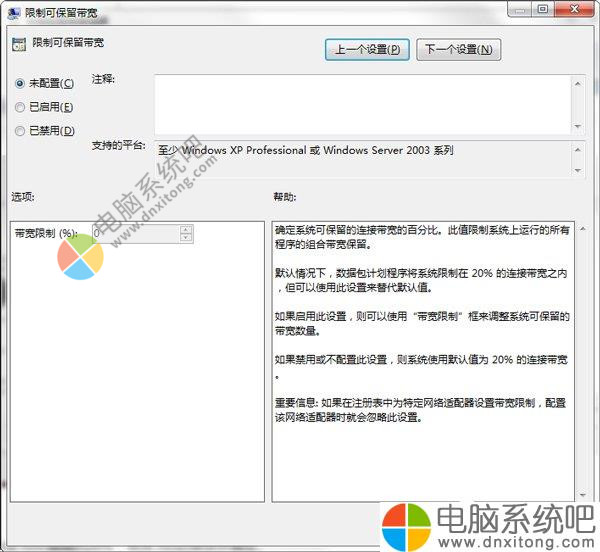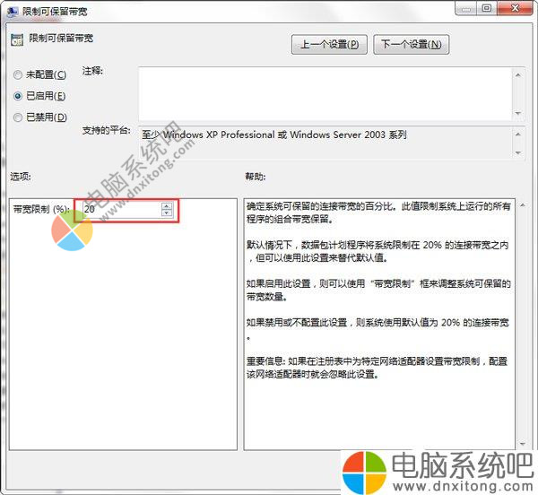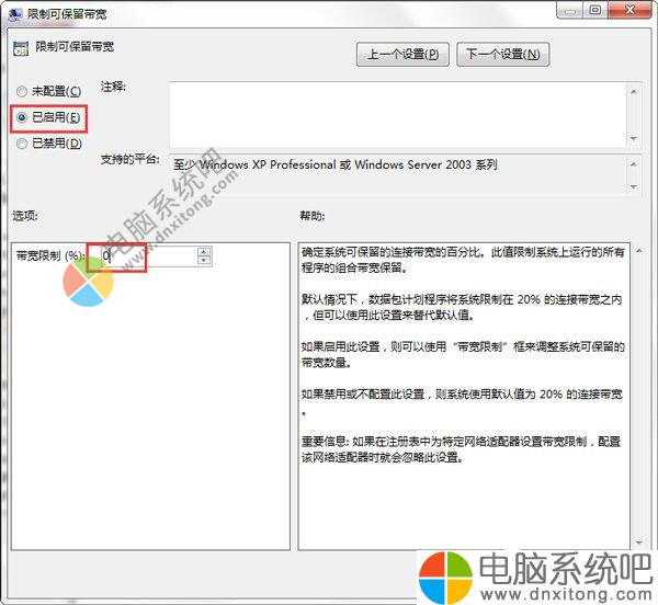 5、现在我们选择已启用,然后下面的带宽限制变为可编辑的20%,修改为0后保存并确定。