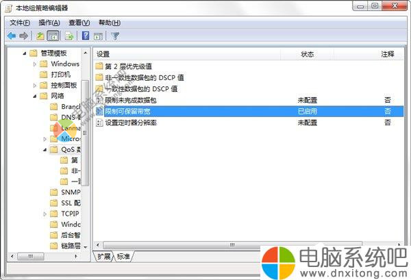 6、最后,在我们确定之后回到本地组策略编辑器界面,后面的限制可保留带宽的状态,由未配置变成了已启用,带宽彻底放宽,看看是否提速了呢?