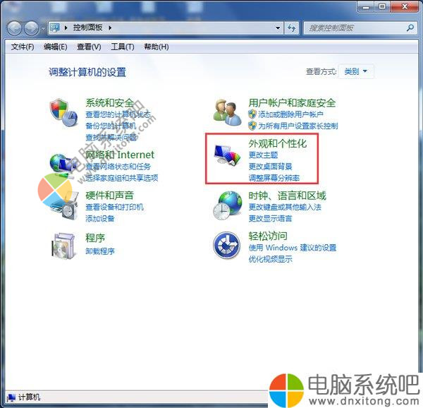 2、找到控制面板界面上的外观和个性化,点击进入。