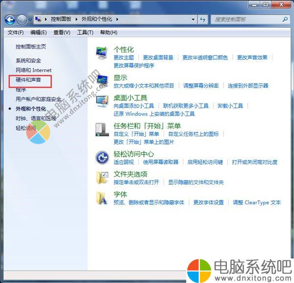 3、接下来在左侧菜单中选择硬件和声音选项。