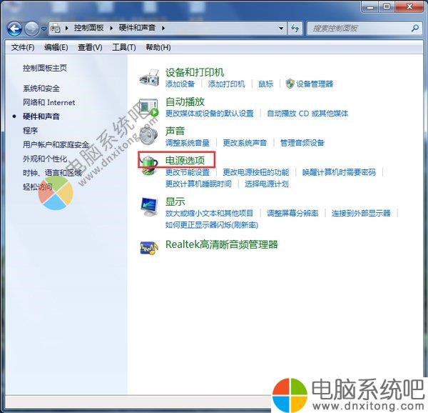 4、在硬件和声音菜单中找到电源选项,点击进入电源选项。