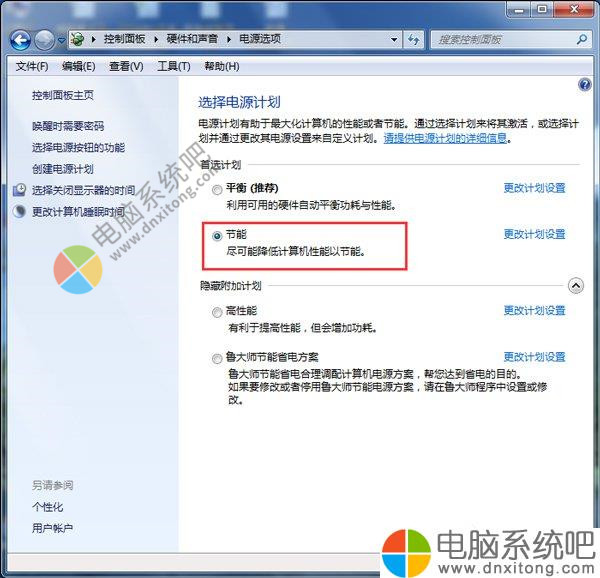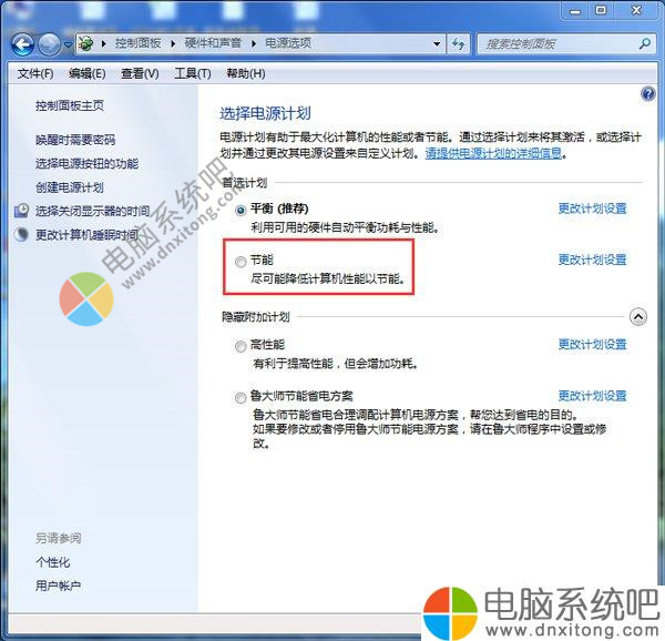 5、这时候在电源计划中可以看到平衡和节能两个选项,目前选择的是平衡选项,点击下边的节能选项。