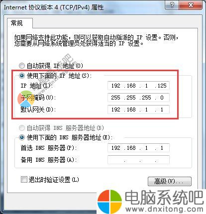 2、在本地连接属性窗口中我们双击【Internet协议】打开Internet协议属性窗口,这里我们选择【使用下面的IP地址】我给大家一个IP地址参考192.168.1.1 这台电脑我称为主电脑(意思是这台电脑通过宽带连接能上网则另一台就可以上网了),只要两台电脑的IP地址在一个网段就可以了,另一台电脑也这样进行设置为192.168.1.2 默认网关和IP地址一样,设置好之后点击确定退出。