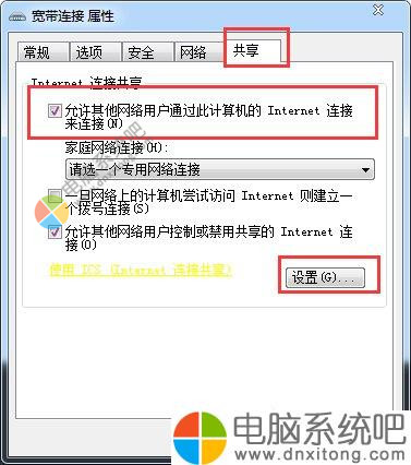 3、然后我们在主电脑里面选择 宽带连接——右键——属性 打开宽带连接属性窗口,在窗口中我们选择高级选项卡,internet连接共享下面第一个我们选中,如下图所示:然后我们选择右下角的设置进入共享设置,这一项只需主电脑设置就可以了,另一台电脑可以不用设置。