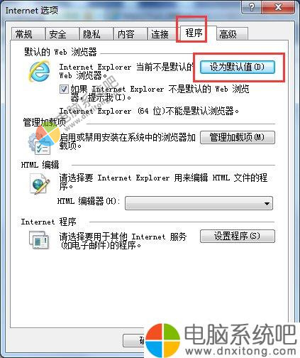 打开【工具】菜单—【Internet选项】,打开【Internet选项】对话框, 打开【程序】选项卡,勾选【检查Internet Explorer是否为默认的浏览器】复选框, 单击【确定】按钮即可设置IE为默认浏览器,关闭对话框。