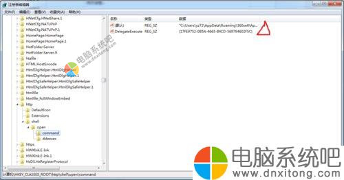 3、然后找到 HKEY_CLASSES_ROOT\http\shell\open\ddeexec\Application,在右边的窗口中双击“默认”,设置浏览器名,如果是360se则输入360se,如果是猎豹则输入猎豹。