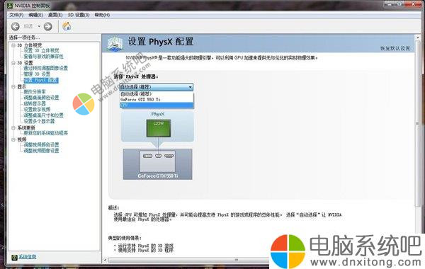 打开物理加速十分简便,在显卡控制面板中有专门的“设置PhysX配置”选项,默认是自动选择,选择自己的显卡,就强制电脑系统在游戏中使用显卡进行物理加速(PhysX):