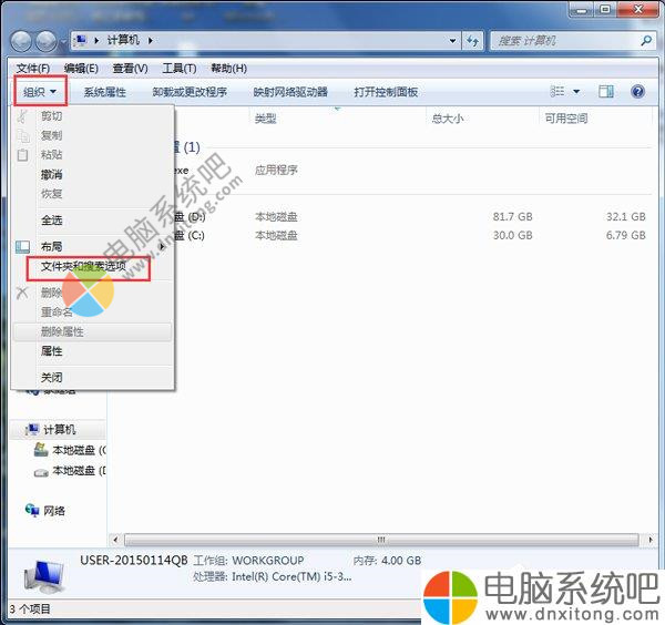 1、打开“计算机”,随便找到一个位置,我们可以看到路径栏下面有一个“组织”选项。