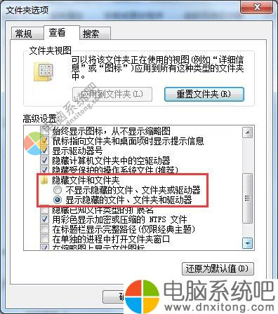 4、在该选项卡下,找到“隐藏文件和文件夹”,并将其设置为“显示隐藏的文件、文件夹和驱动器”。