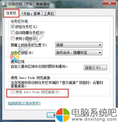 2、进入任务栏和开始菜单属性界面,单击“任务栏”选项卡,将下面“使用Aero Peek预览桌面”打勾,单击“确定”。