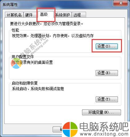 3、进入“高级”选项卡界面,点击性能下的“设置”按钮。