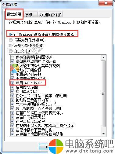 4、进入性能选项窗口,点击“视觉效果”标签,在Windows 外观和性能设置列表中找到“启用 Aero Peek”,打上勾,单击“确定”。