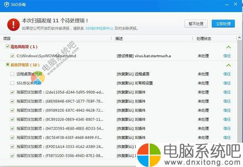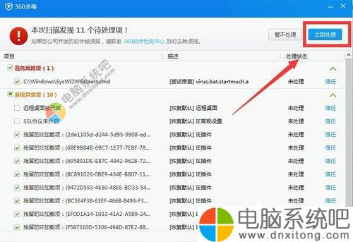 4、等电脑杀毒软件查杀完成之后,点击“立即处理”即可除去病毒,如图: