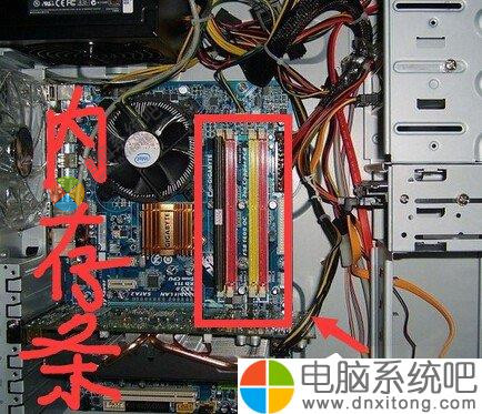 2、打开电脑机箱,在电脑机箱内找到主板上的内存条,如图: