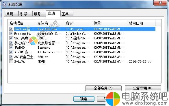 有些不必要的启动项就禁止其开机自启动,开机启动项就保留输入法(Ctfmon)、杀毒软件外,其他的程序都可以禁用。