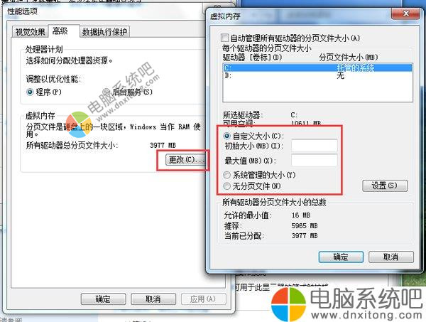 4)在“性能选项”窗口的“高级”选项卡中,有个虚拟内存,然后点击“更改”,选定自定义,然后进行虚拟内容的扩大,只要在符合容量要求内均可,但是也不宜过大。