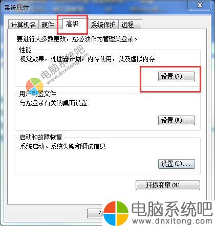3)在弹出的窗口的“高级”选项卡,找到性能列表的“设置”