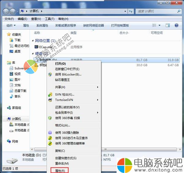 1)打开计算机,然后点击要清理的硬盘,右键的菜单栏,点击“属性”