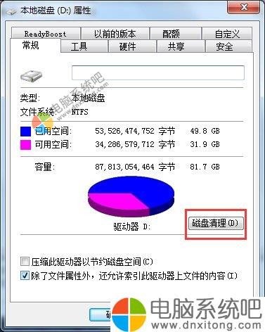 2)然后弹出的框中,点击“磁盘清理”
