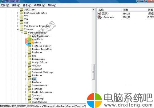 2)然后按照这个顺序找到这个根键,HKEY_CURRENT_USER\Software\Microsoft\Windows \CurrentVersion\Policies\Explorer\Run,右侧那个框里的就是启动项啦,把一些无用的启动程序直接删除,就OK。