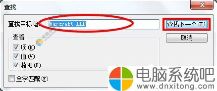 3、出现“注册表编辑器”,然后同时按ctrl+F键,出现查找窗口,接着输入Warcraft III,按确定。