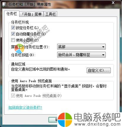 3、点击属性以后任务栏和开始菜单属性窗口出现,然后把任务栏下面的隐藏不活动的图标左边打上勾。