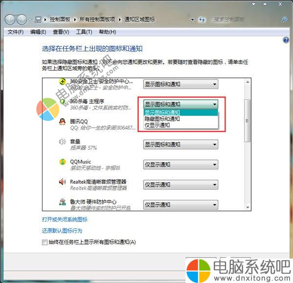 6、在自定义通知窗口下面的当前选项栏里面设定当前项目的行为,点击项目右边对应的行为,点击项目行为出现下拉菜单,在下拉菜单里面可以选择再不活动时隐藏,然后点击确定这样就就会把任务栏里面的图标隐藏起来。