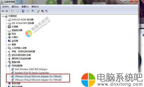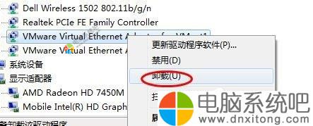 1、打开【计算机】——【属性】——【设备管理器】,找到网络适配器一项,看到里面所有VM开头的虚拟机网卡,全部右击【卸载】。