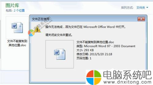 讲解实例中一个Word文档被Office2003打开,真正进行编辑。当我用常规的操作选中Word文档进行复制时,电脑系统弹出对话框提示无法复制。