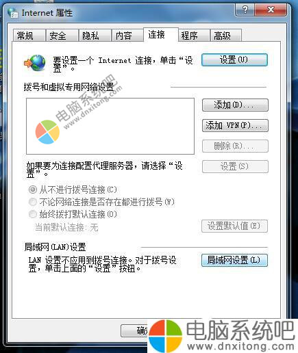 4、设置IE浏览器。在不能上网的电脑上在IE上依次打开“工具”-“Internet选项”-“连接”-“局域网(LAN)设置”,如下图所示,填写代理服务器IP地址和端口号。设置完毕后,点击确定退出。
