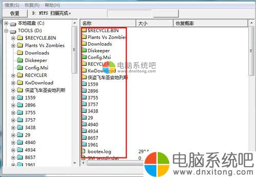 4、搜索完毕,所有在这个盘中曾经删除过的文件就全部被列在软件右侧的这个列表中了,包括各种类型的文件。