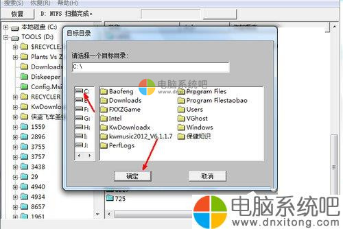 6、选择恢复之后,下一步要选择一下所删除文件恢复需要保存的路径,即你要把这些恢复的文件放在什么地方。选择一个位置,点击一下,然后点击确定。
