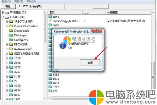 8、最后 ,所有已选择数据恢复完成,这时会跳出一个提示对话框,框中显示这些文件已经被成功恢复。点击确定之后你还可以继续恢复别的已经删除并被查找出来列在列表中的文件。