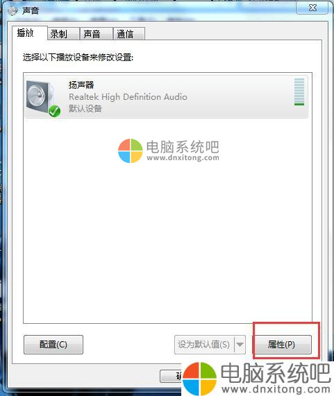 5、然后我们可以在 声音选项中,找到播放选项卡,然后下面会显示一个电脑系统默认的播放设备,即扬声器,点击一下这个使用中的扬声器,然后点击右下角的属性按钮。