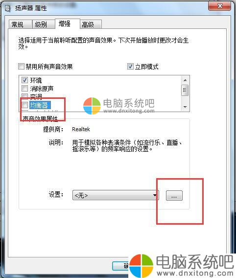 8、在此选项卡下,有一个均衡器的选项,我们可以选定此项,然后再在下面的声音效果属性中,点击设置最右边的三个点的按钮。如图所示。