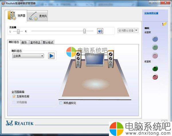 12、打开声卡驱动程序,我们可以看到默认是在扬声器的选项上,下面有一个主音量的调节滑块,默认也不是在最大声上面的,即使将电脑系统托盘上的音量调节到最大,那么声卡也还是有增大声音的潜力的,所以,我们可以通过声卡驱动将其音量潜能发挥到最大,调节到最右端,那么电脑系统的音量会在原来的基础上有一个很大的提升。