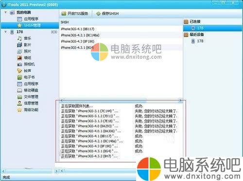 4、下方的信息列表会提示当前SHSH的备份情况。每当更新一个新版本固件,对应老版本的SHSH就无法备份了,所以会提示:“失败,您行动的太晚了。”