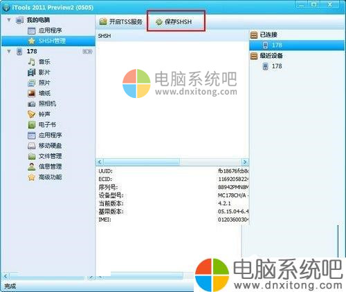 3、右侧会提示当前连接的设备,以及曾经连接备份SHSH的设备列表。选中你需要备份SHSH的设备。然后点击上方的保存SHSH项按钮。