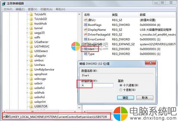 2.依次展开“HKEY_LOCAL_MACHINE”→“SYSTEM”→“ CurrentCntrolSet”→“ Services”→“USBSTOR”,在窗口右侧找到键“Start”,将其值由“3”改为“4”,然后重启一下电脑即可。