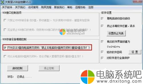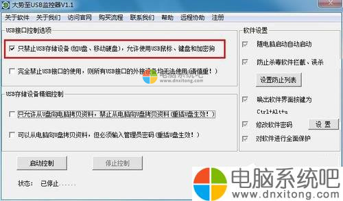 3.在打开的程序主窗口中,确保勾选“USB接口控制选项”下面的“只禁止USB存储设备”,对于“禁止所有USB设备”选项,建议不要勾选,否则将会导致USB鼠标和键盘不可用!