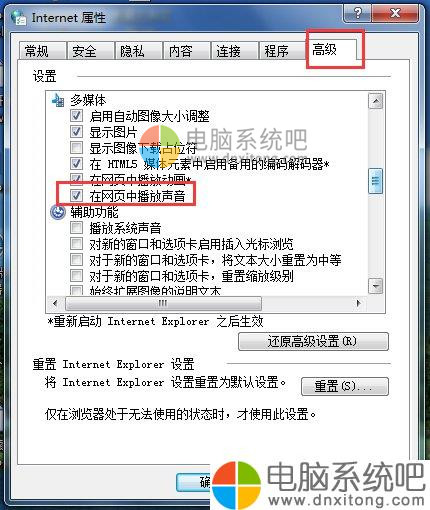 4、切换到“高级”选项卡,勾选“在网页中播放声音”项,点击“确定”完成设置。