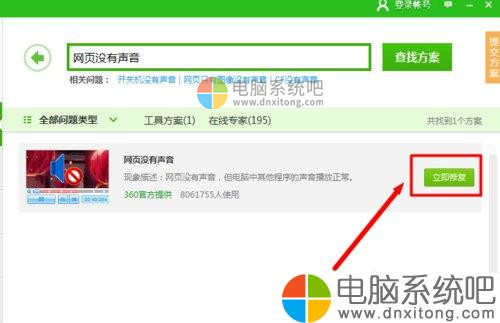 2、在打开的“360人工服务”窗口中,输入“网页没有声音”并进行搜索,从搜索结果列表中点击“立即修复”按钮进行修复操作。