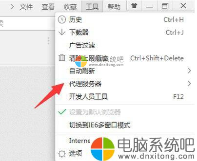 1、首先可能是我们浏览器使用了代理,我们打开桌面的浏览器找到右上角的工具打开,在下拉菜单中找到代理服务器选项。