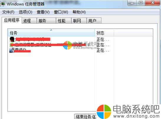 3、然后在任务管理器中找到应用程序选项,把一些不必要的程序结束进程,然后在重启浏览器打开网址就行了。