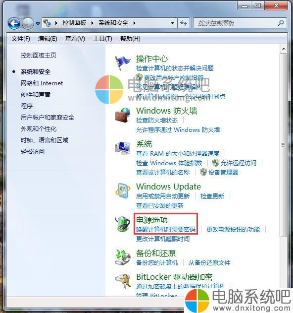 3、如果打开控制面板,你看到的是这样子的,不要紧,可以选择“电脑系统和安全”,也能找到唤醒计算机时需要密码的选项,就在电源选项下方,如下图。