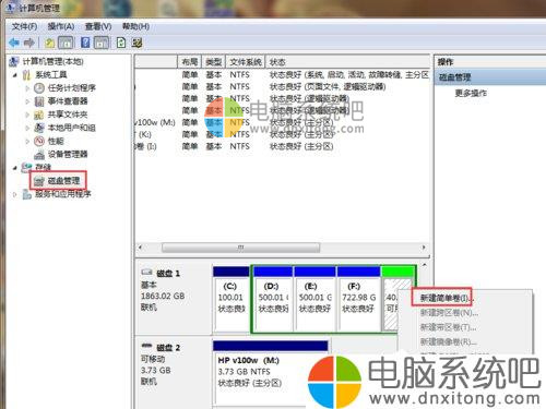 3、首先想到的方法是进入计算机→右键→管理→磁盘管理中进行分区的删除和重建。因为有时候有可能是分区未分配导致无法格式化的。