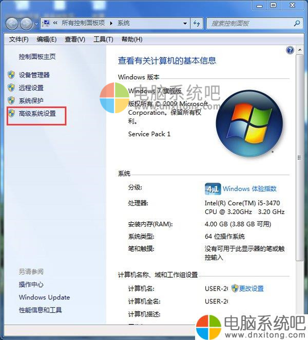 4、然后在左侧找到“高级电脑系统设置”,点击进入。
