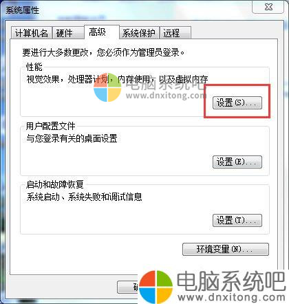 6、点击“高级”窗口下性能选项的“设置”按钮,发现在性能中有一项叫做虚拟内存的应该就是我这个文件的专属名称。