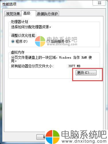 8、在其中发现一项虚拟内存选项,点击“更改”按钮。