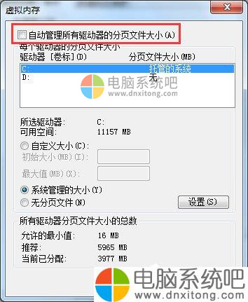 9、第一步将自动管理所有驱动器的分页文件大小的勾取消。